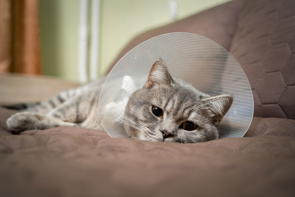- Keep the Elizabethan collar on at all times. We know pets hate them, but one good rub can undo the entire surgery.